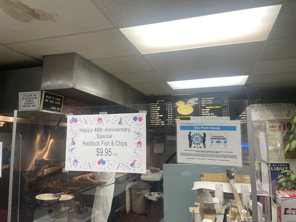 Freshly fried halibut and fries served with coleslaw, bread, and butter.